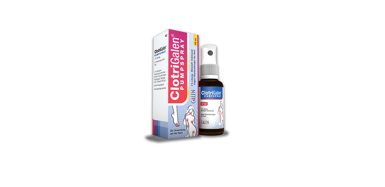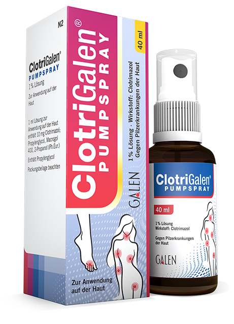 Anwendungsgebiete: ClotriGalen® wird angewendet bei Pilzinfektionen der Haut durch Fadenpilze (Dermatophyten), Hefen (z. B. Candida-Arten), Schimmelpilze und andere, wie Malassezia furfur sowie Infektionen durch Corynebacterium minutissimum. Diese können sich äußern als Fußpilz, Pilze der Haut und der Hautfalten, Kleienpilzflechte (Pityriasis versicolor), Zwergflechte (Erythrasma) und als oberflächliche Candidosen.